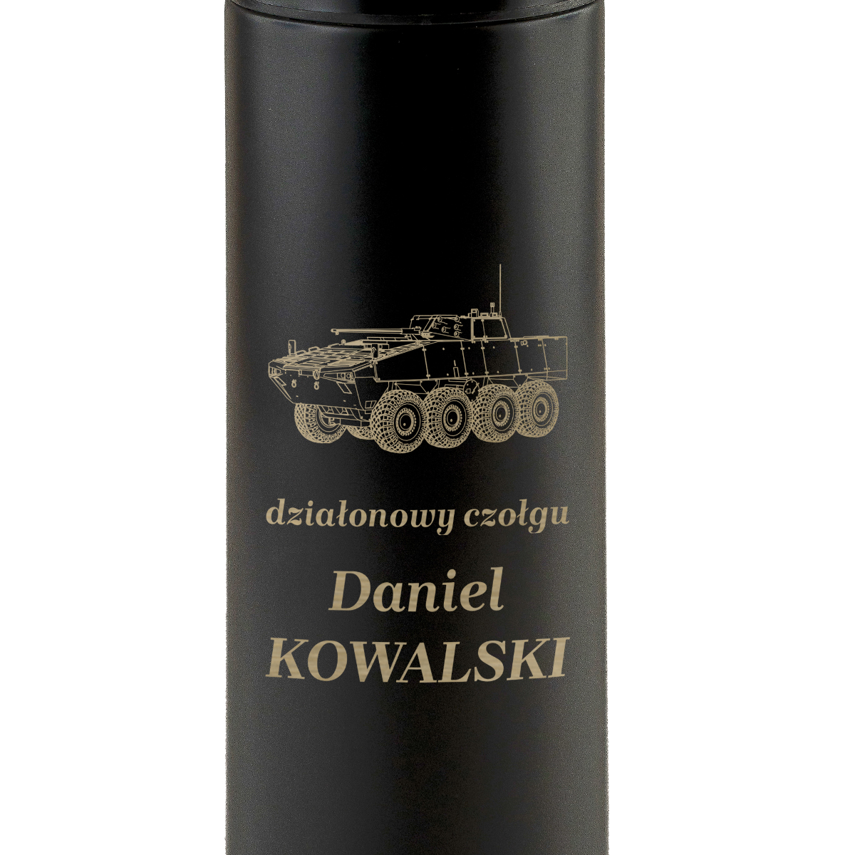 Masz ochotę wręczyć żołnierzowi czołgiście termos z grawerem w prezencie? Elegancki czarny termos z grawerem przedstawiającym czołg Rosomak oraz tekst "działonowy czołgu" to doskonały wybór na urodziny, imieniny, Dzień Ojca czy z okazji ukończenia szkolenia wojskowego. Ten duży termos grawerowany idealnie sprawdzi się jako militarny termos, który można podarować jako termos z dedykacją. Dzięki personalizacji umieścimy imię czołgisty lub inny krótki dopisek. Podaruj bliskiej osobie coś, co będzie przypominać o szczególnej okazji i budować wspólne wspomnienia.