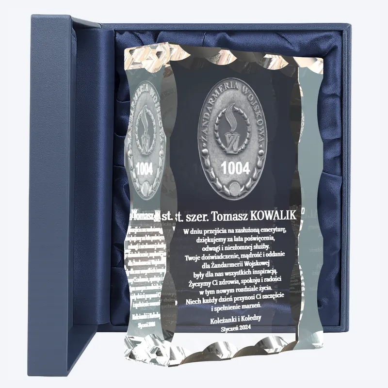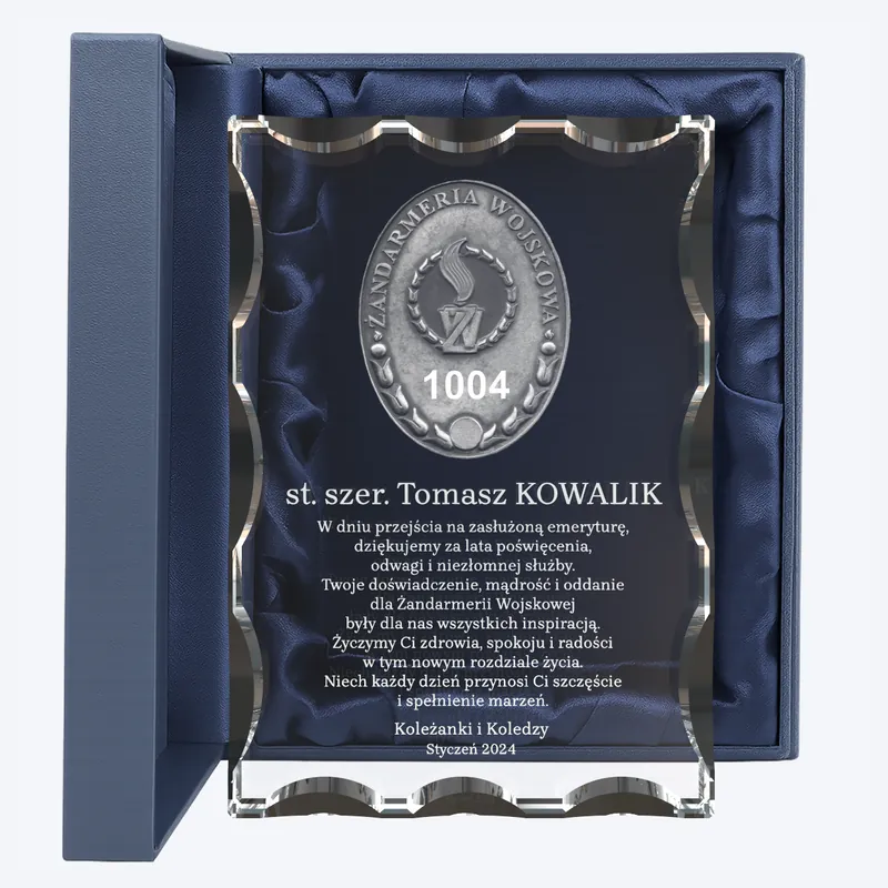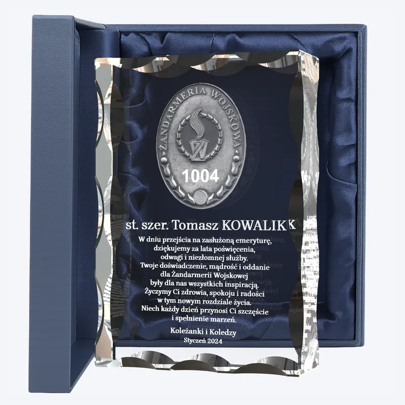 Szklana statuetka Żandarmerii Wojskowej przygotowana jest jako pamiątka wręczana przez kolegów i koleżanki z jednostki. Pamiątka najczęściej wybierana jest przy przejściu na emeryturę, zakończeniu służby albo zmianie miejsca pracy. Personalizowany prezent ma prostą formę i jasny przekaz – odnosi się bezpośrednio do służby i wspólnie spędzonego czasu. Dzięki temu statuetka dobrze sprawdza się podczas spotkań pożegnalnych, gdzie liczy się personalizowana pamiątka, a nie przekombinowana, sztampowa forma.