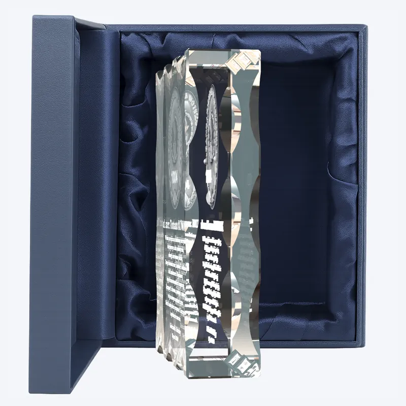 Statuetka wykonana jest z grubego szkła, co od razu czuć po wzięciu jej do ręki. Boki posiadają dekoracyjne, wyżłobione wycięcia widoczne z przodu i z boku, dzięki czemu światło załamuje się na krawędziach. Prostokątny kształt daje dużą powierzchnię na grawer, co pozwala na czytelne rozmieszczenie tekstu nawet przy dłuższej treści. To ważne przy tego typu prezentach, gdzie często oprócz nazwiska pojawia się pełne podziękowanie od zespołu.