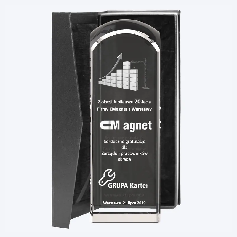 Prezenty na rocznicę pracy, szczególnie te z okazji 10-lecia, 20-lecia, a nawet 30-rocznicy firmy, wymagają specjalnego podejścia. Spersonalizowany prezent, jakim jest statuetka kryształowa, to doskonały sposób, by wyrazić uznanie dla lat solidnej pracy pracowników lub podziękować partnerom biznesowym za owocną współpracę. Dostosowane do okazji jubileuszu firmy grawerowane życzenia czy wizerunki, które można umieścić w kryształowym wnętrzu statuetki, czynią każdy egzemplarz unikalnym.