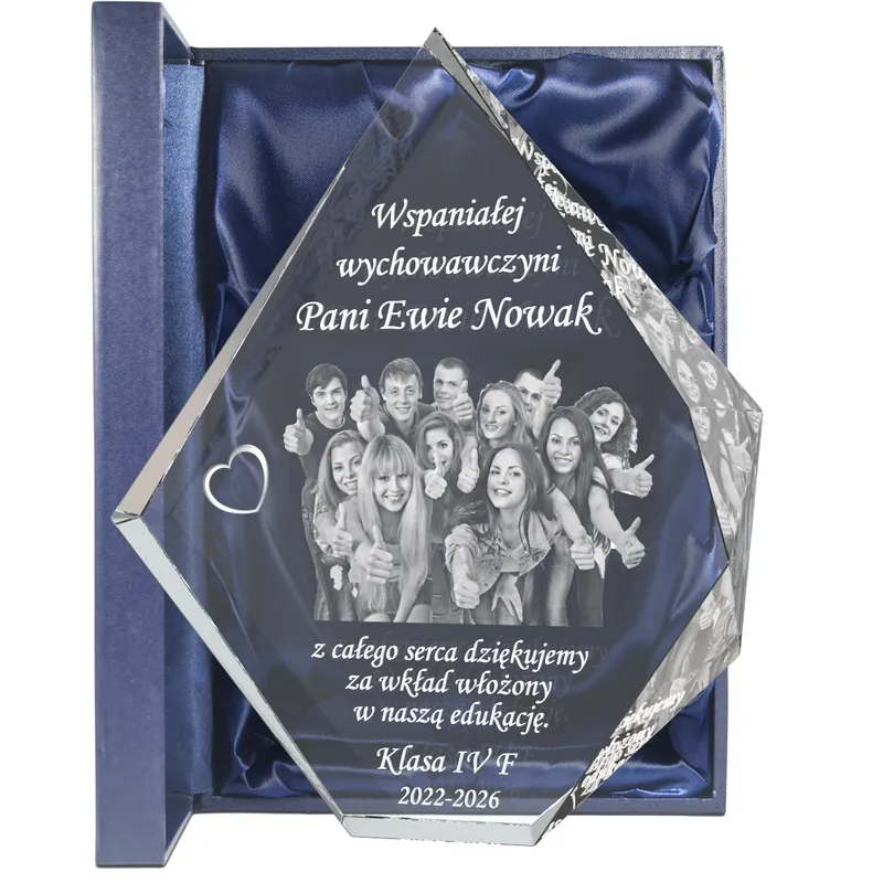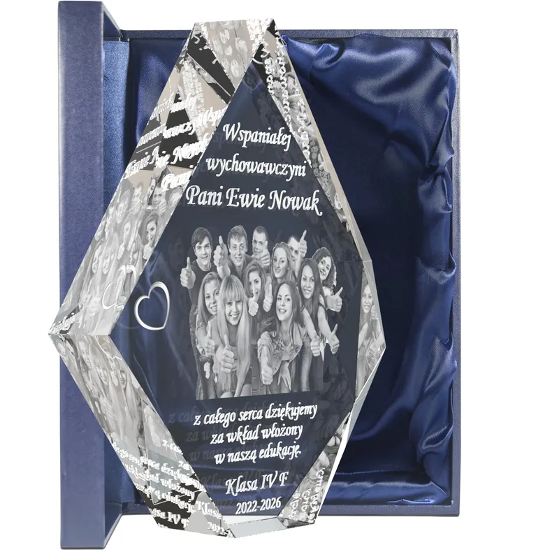 Statuetka wykonana jest z bardzo grubego szkła, dzięki czemu stoi stabilnie i dobrze prezentuje się na biurku lub półce. Najważniejszy element to grawer wykonywany wewnątrz szkła, gdzie umieszczane jest zdjęcie klasy (np. ze studniówki lub innego dnia wraz z nauczycielem) oraz dedykacja od maturzystów. Wszystko znajduje się w środku statuetki, a powierzchnia pozostaje gładka. Fazowane krawędzie pienie odbijają światło i podkreślają kształt statuetki.