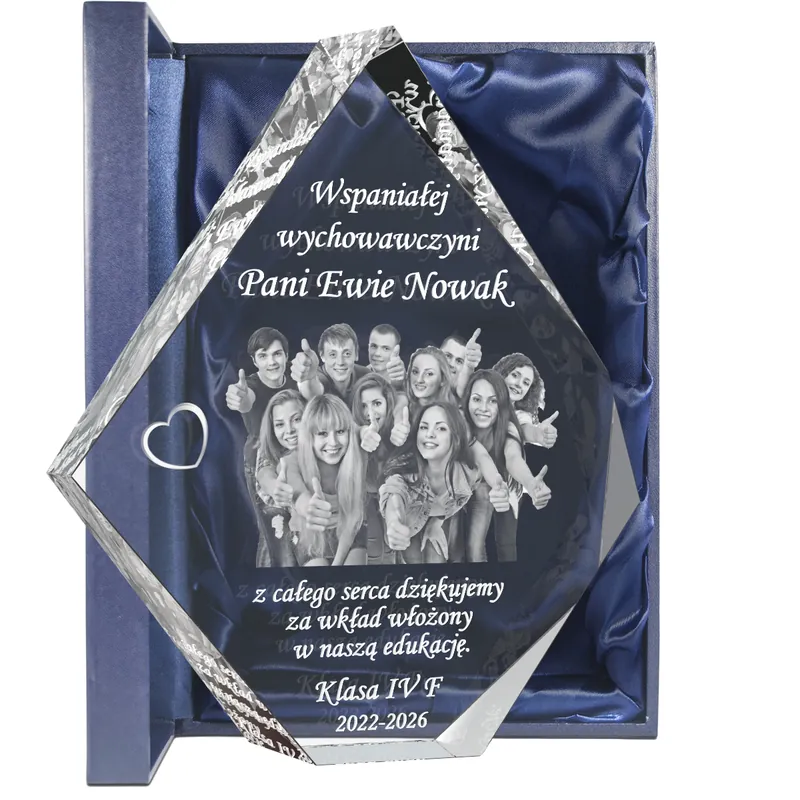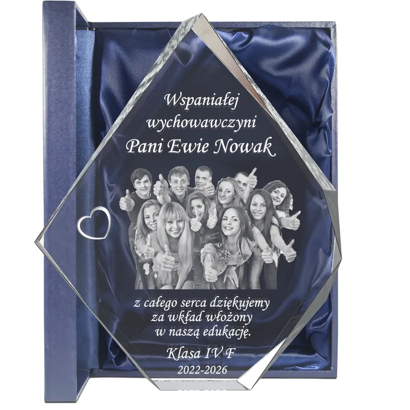 Prezent na koniec szkoły średniej od maturzystów to wyjątkowa pamiątka dla wychowawcy lub nauczyciela. Na statuetce można umieścić zdjęcie klasowe, imię nauczyciela, wychowawcy oraz tekst podziękowania. Projekt przygotowywany jest indywidualnie – wystarczy przesłać fotografię i treść, a całość zostanie dopasowana do wybranej statuetki. Taki upominek dobrze oddaje wspólne lata nauki i zostaje na długo.