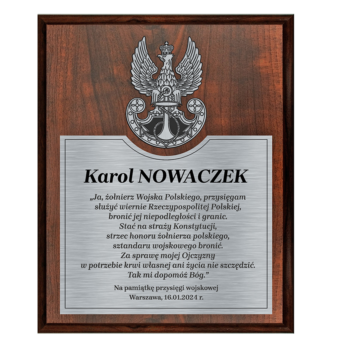 Projekt łączy srebrny laminat grawerski z ciemną deską drewnianą, tworząc kontrastową kompozycję. Grawer laserowy jest trwały, wyraźny i odporny na upływ czasu. Laminat o srebrnym połysku pięknie kontrastuje z ciemnym kolorem drewna deski, dzięki czemu ryngraf stanowi dekoracyjną pamiątkę, idealną do postawienia w gabinecie lub zawieszenia na ścianie. Ryngraf na przysięgę wojskową składa się z 3 elementów: grawerowany orzeł Marynarki Wojennej, tabliczki z tekstem przysięgi oraz drewniany dyplom.