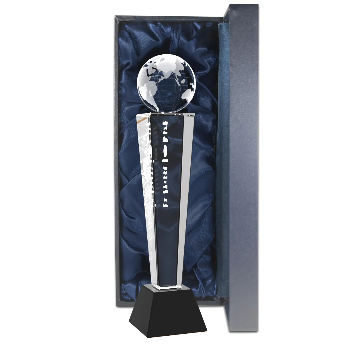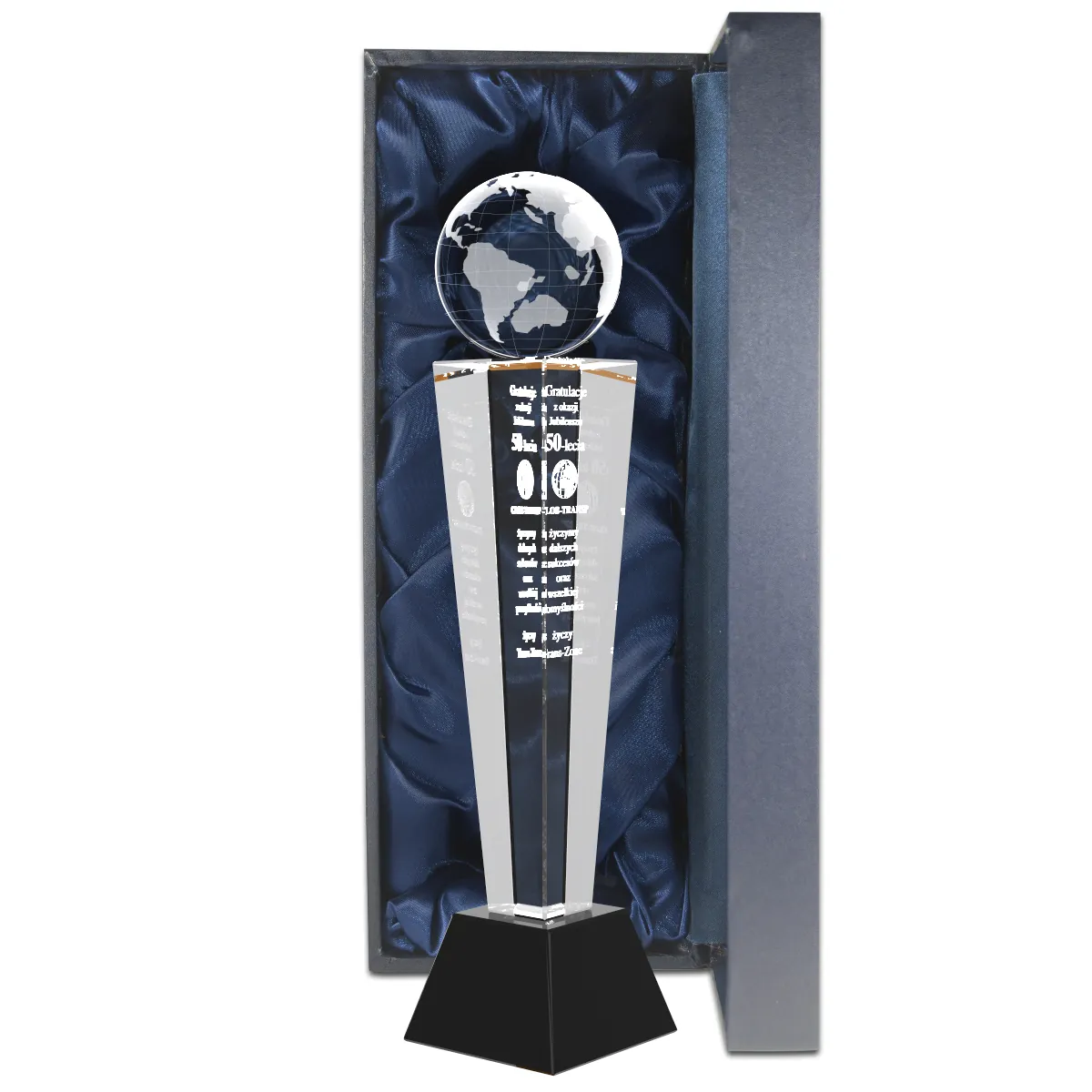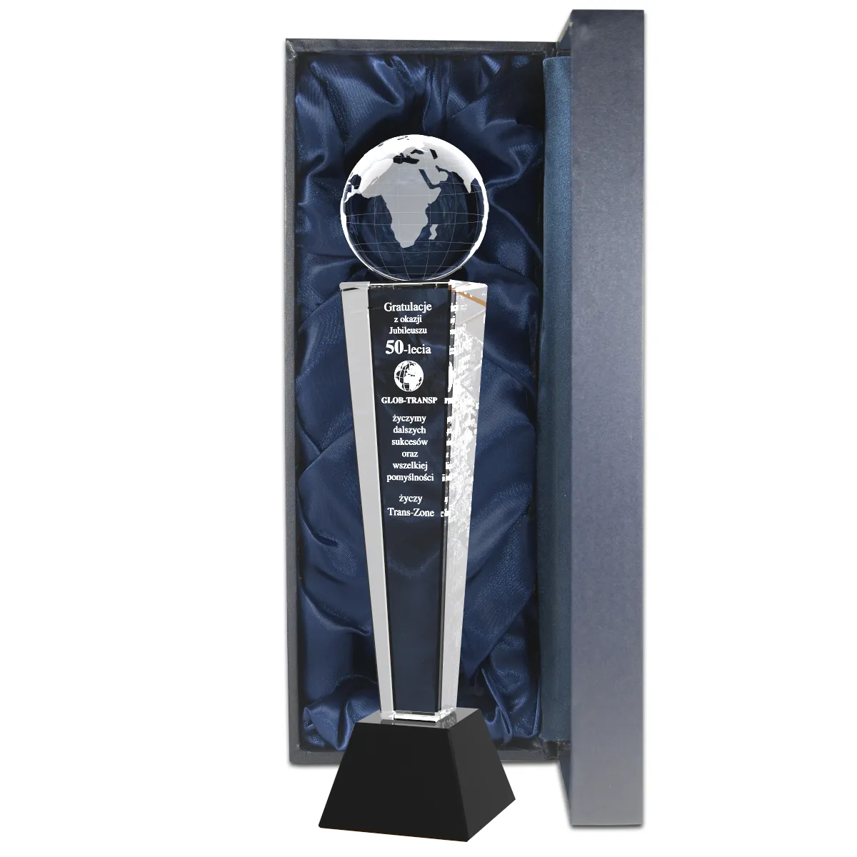 Szklana statuetka z globusem to wyjątkowy prezent na 50-lecie firmy, który łączy prostą formę z profesjonalnym wyglądem. Wewnątrz wysokiego kryształu wykonujemy precyzyjny grawer z logo, nazwą firmy i życzeniami, dzięki czemu całość zyskuje charakter indywidualny i dopasowany do jubileuszu konkretnego przedsiębiorstwa. Na górze statuetki znajduje się kula ziemska z zaznaczonymi metodą piaskowania kontynentami, symbolizująca rozwój, ekspansję i globalny zasięg działalności. Całość umieszczona jest na czarnej podstawie, a w zestawie znajduje się granatowe etui prezentowe. W środkowej części szkła wygrawerujemy personalizowany tekst, grafikę. Dolna część do podstawa, szkło barwione w masie na czarno, elegancka i stabilna.