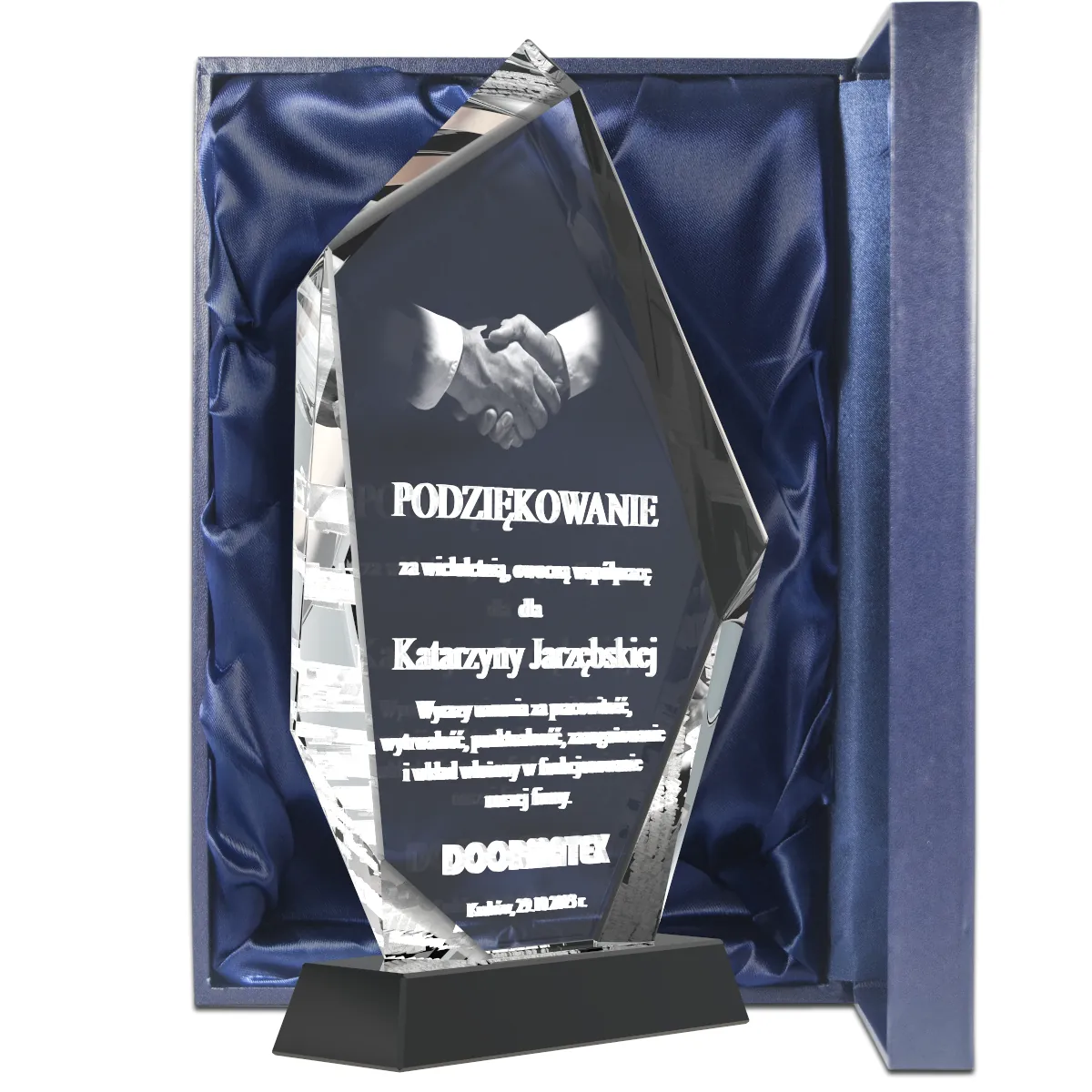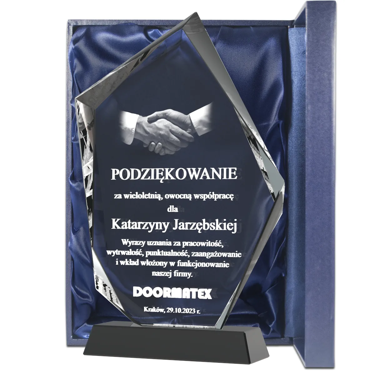 Wewnątrz szkła wygrawerujemy imię i nazwisko pracownika, nazwę firmy, datę oraz indywidualny tekst uznania. Istnieje możliwość dodania logo lub prostej grafiki, co czyni ten prezent jeszcze bardziej dopasowanym. Szklana forma sprawia, że jest to pamiątka trwała i reprezentacyjna – godna miejsca w biurze lub domu. Świetnym upominkiem może być również statuetka z grawerowanym zdjęciem z okazji jubileuszu pracy, również w pełni personalizowana.
